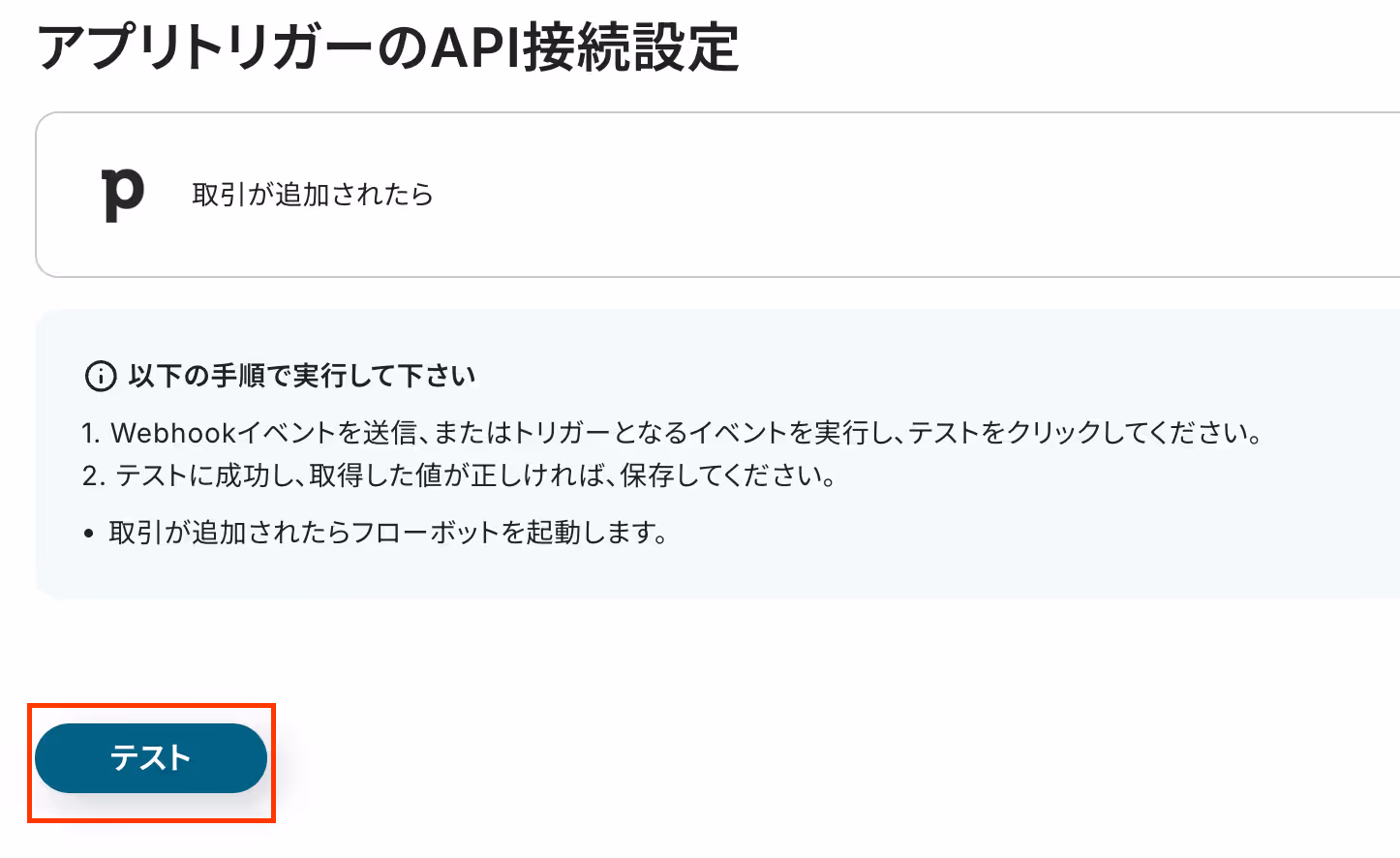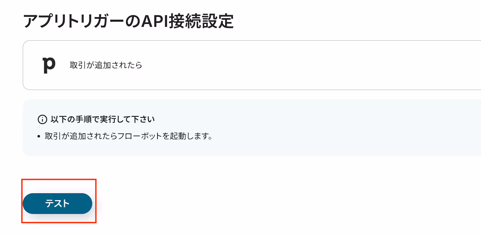 アプリトリガーのAPI接続設定に進んだら、テストをクリックし、次へを選択してください。