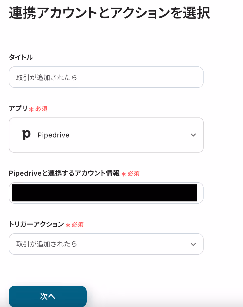 連携アカウントとアクションを選択の設定は、以下を確認後、次へをクリックしましょう。