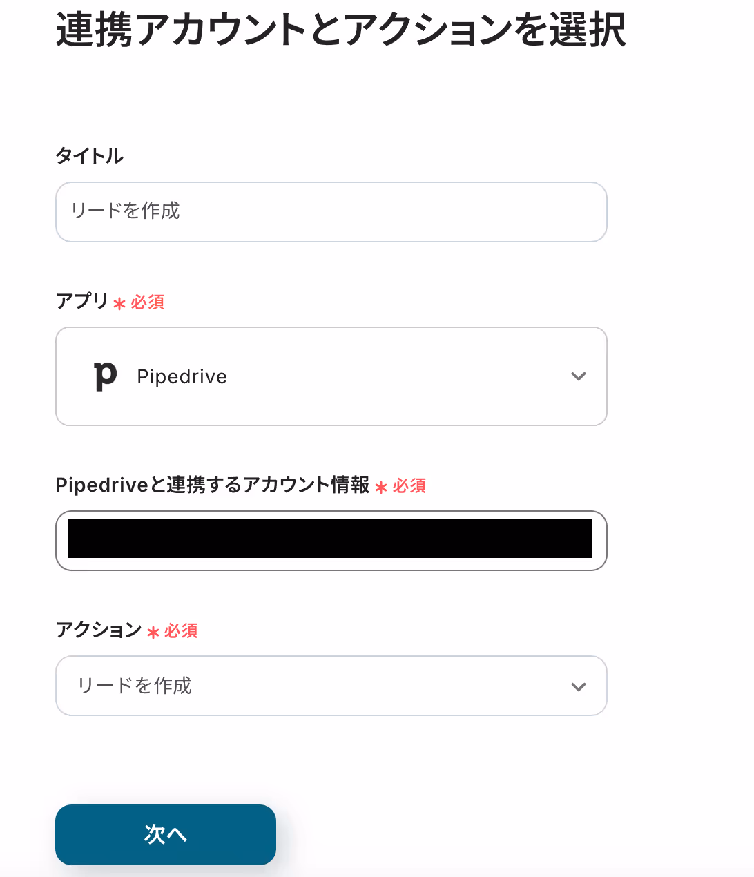 連携アカウントとアクションを選択する画面は、以下を確認し、次へをクリックしましょう。