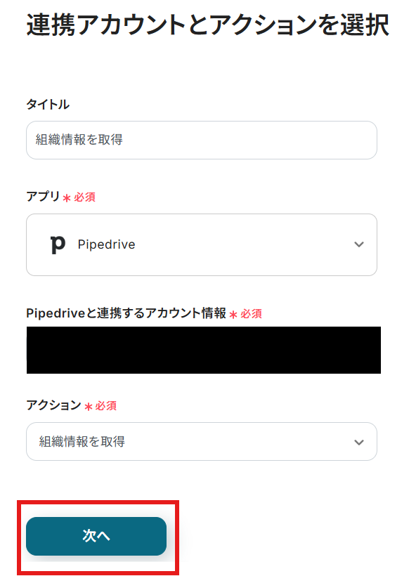 タイトルと連携するアカウント情報を確認し、アクションはテンプレート通りのまま「次へ」をクリックして進んでください。