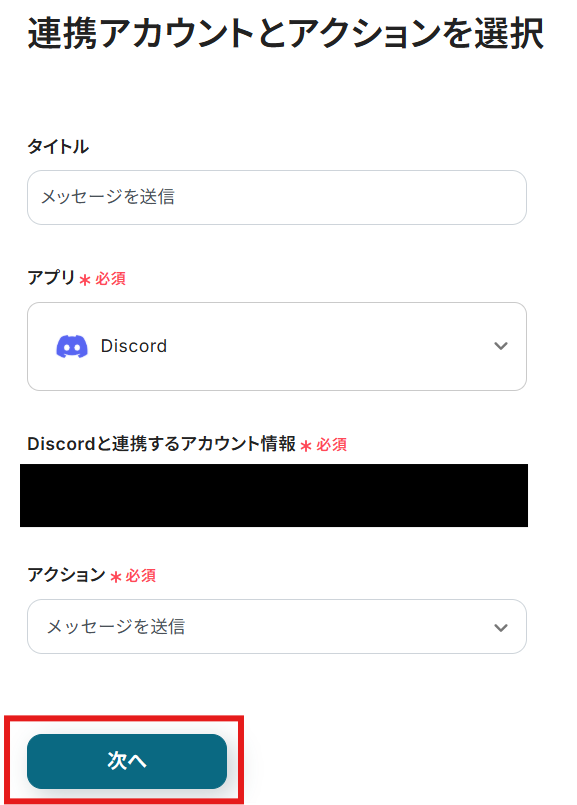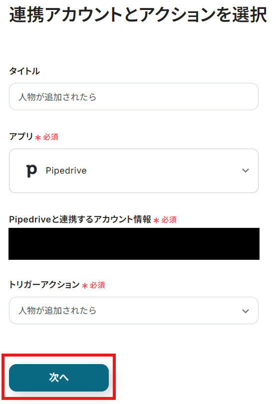 タイトルと連携するアカウント情報を確認し、アクションはテンプレート通りのまま「次へ」をクリックして進んでください。