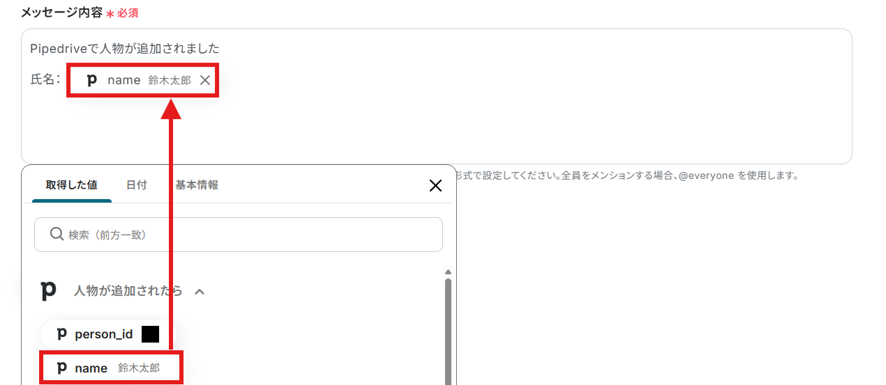 今回は固定のテキストと「取得した値」を用いて以下のように設定しました!