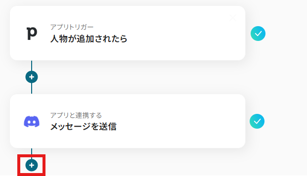 Pipedriveで人物が追加されたらDiscordに通知し、かつNotionにも記録するには、Discordのオペレーション直下にある「+」マークをクリックし、オペレーションを追加することで実現可能できます。