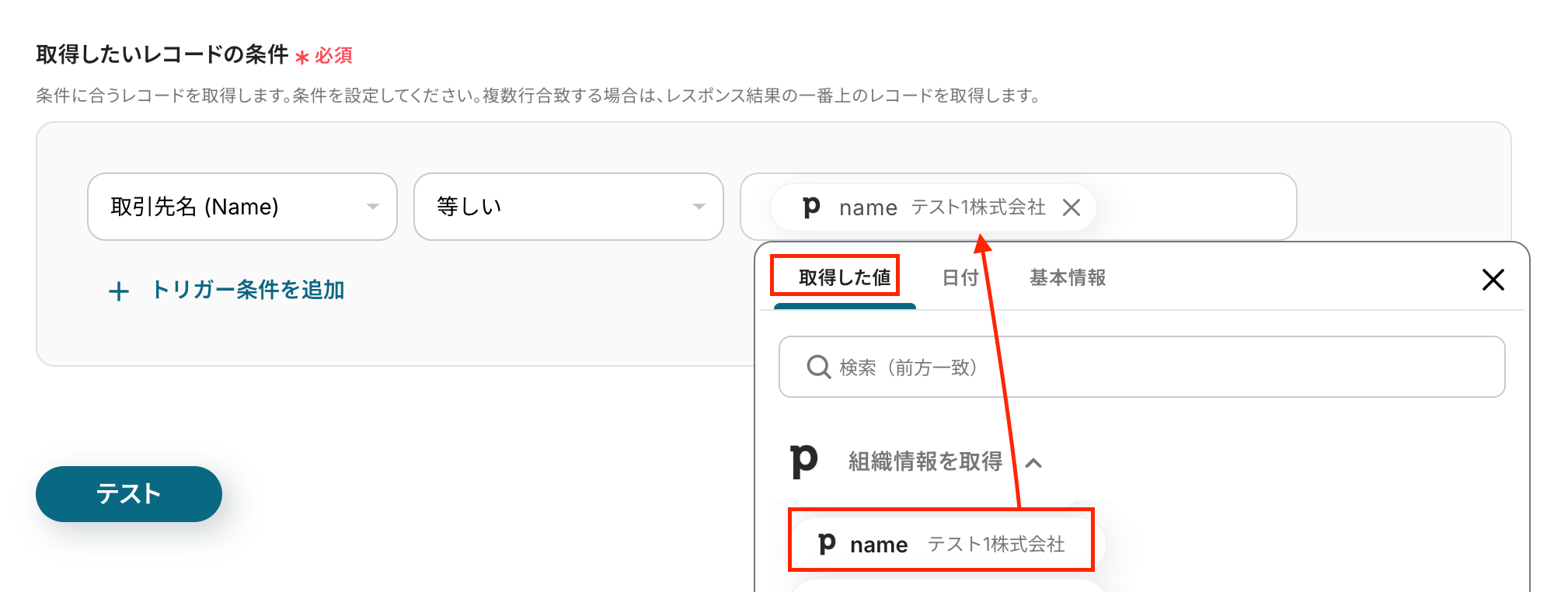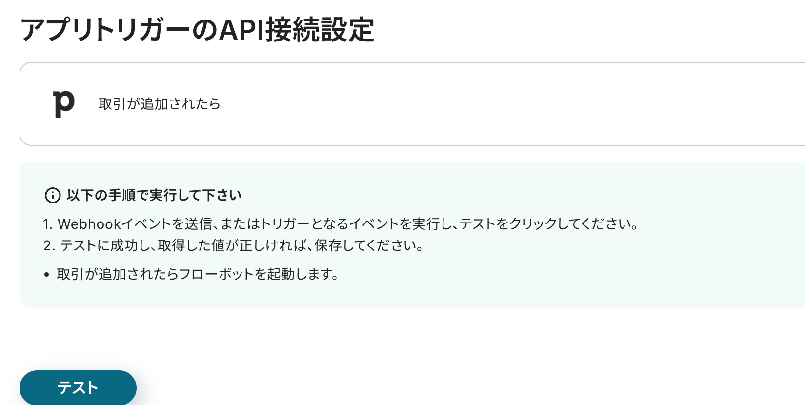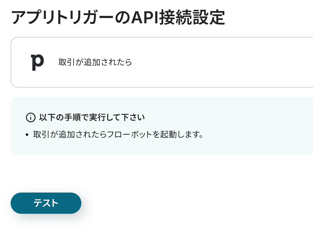 アプリトリガーのAPI接続設定の画面に進み、テストをクリックしましょう。