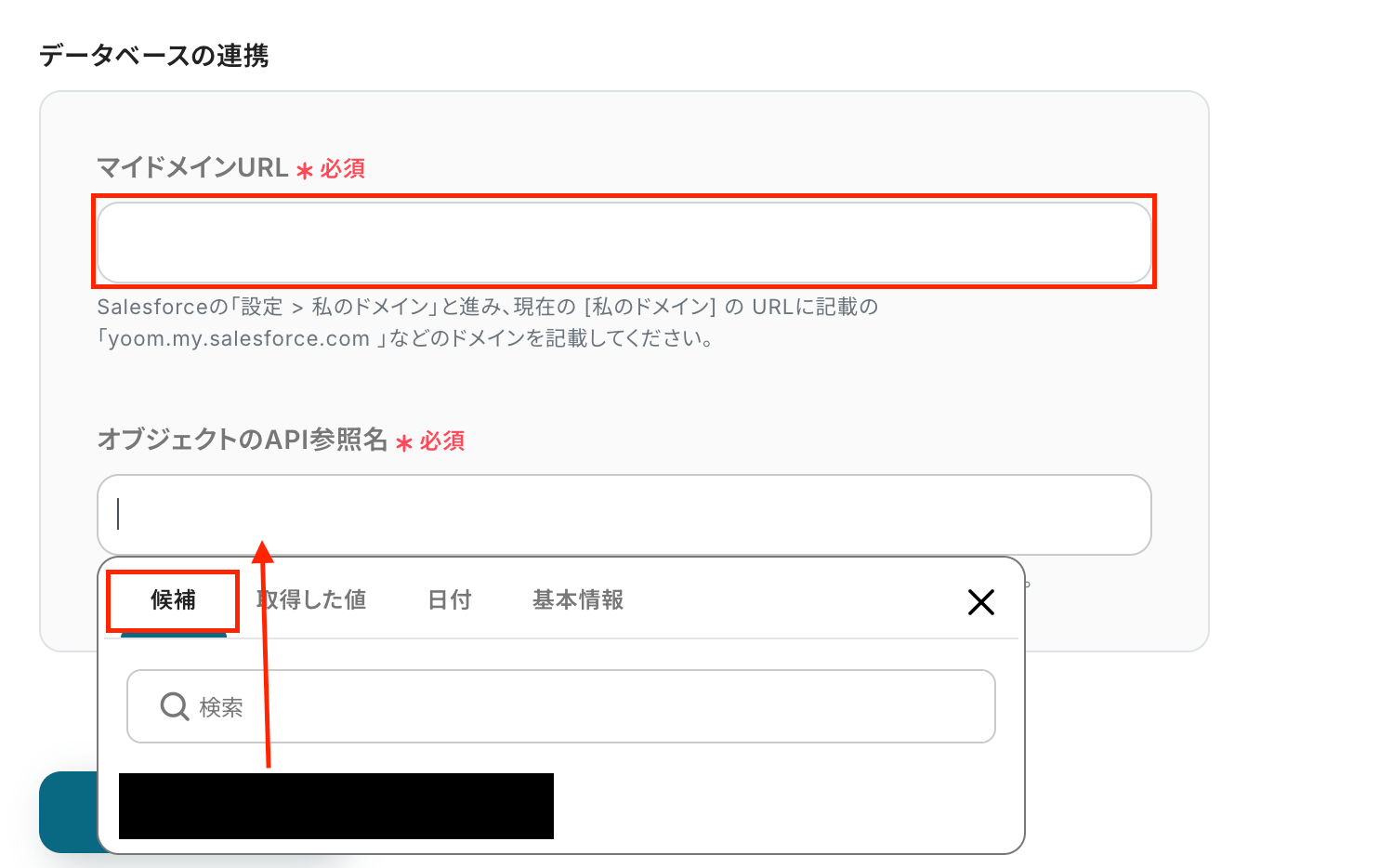Salesforceは候補から選択するか、注釈に記載されている内容を確認して設定しましょう。