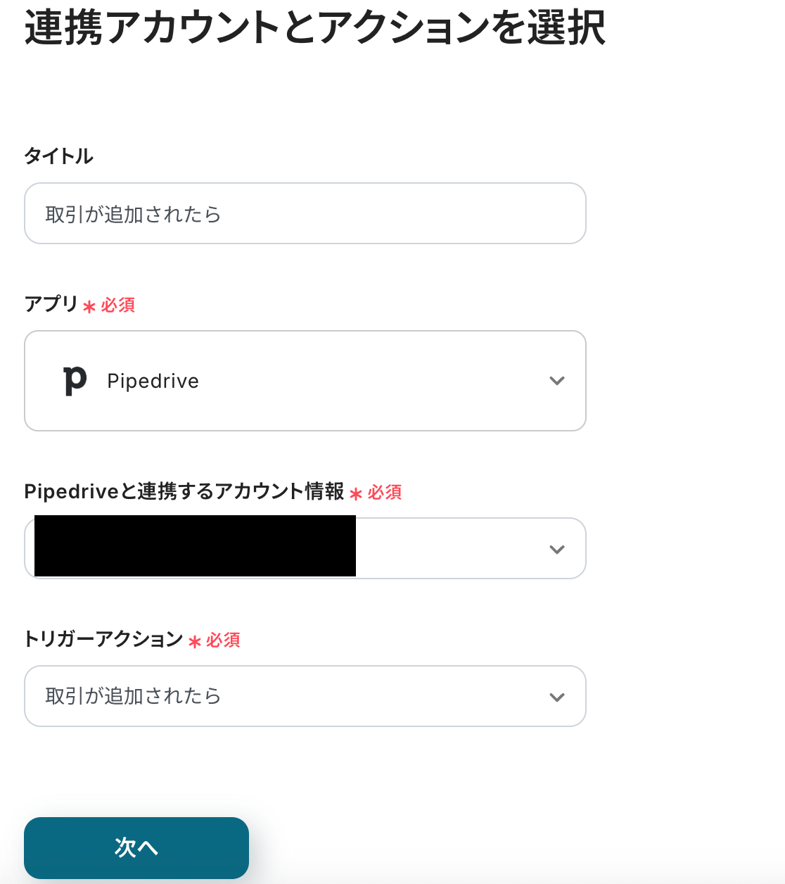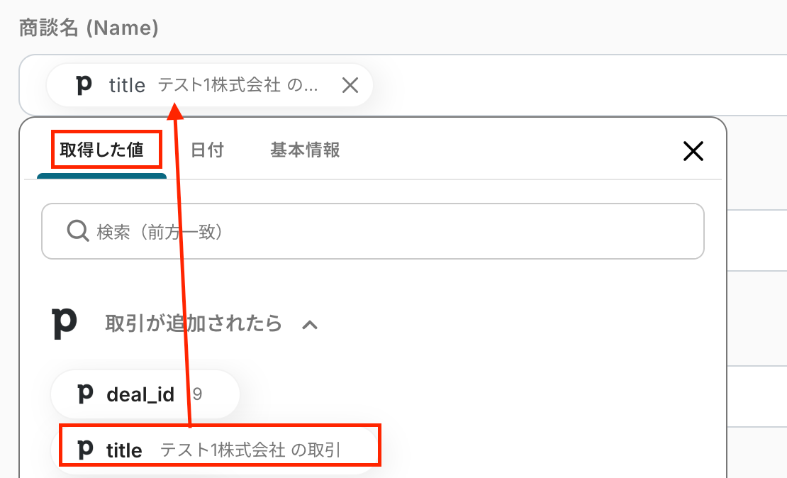 商談名はPipedriveのトリガーで取得した値を選択してください。