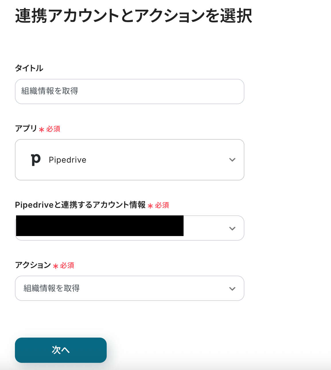 連携アカウントとアクションを選択する画面に進んだら、以下を確認しましょう。