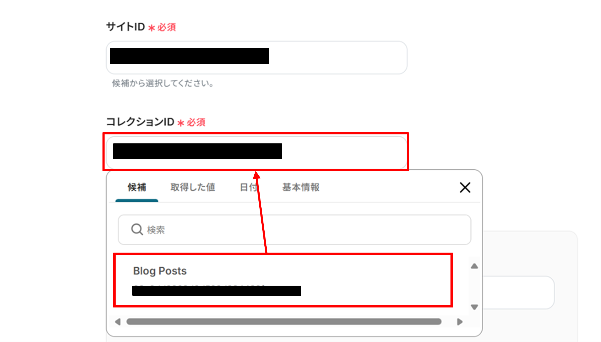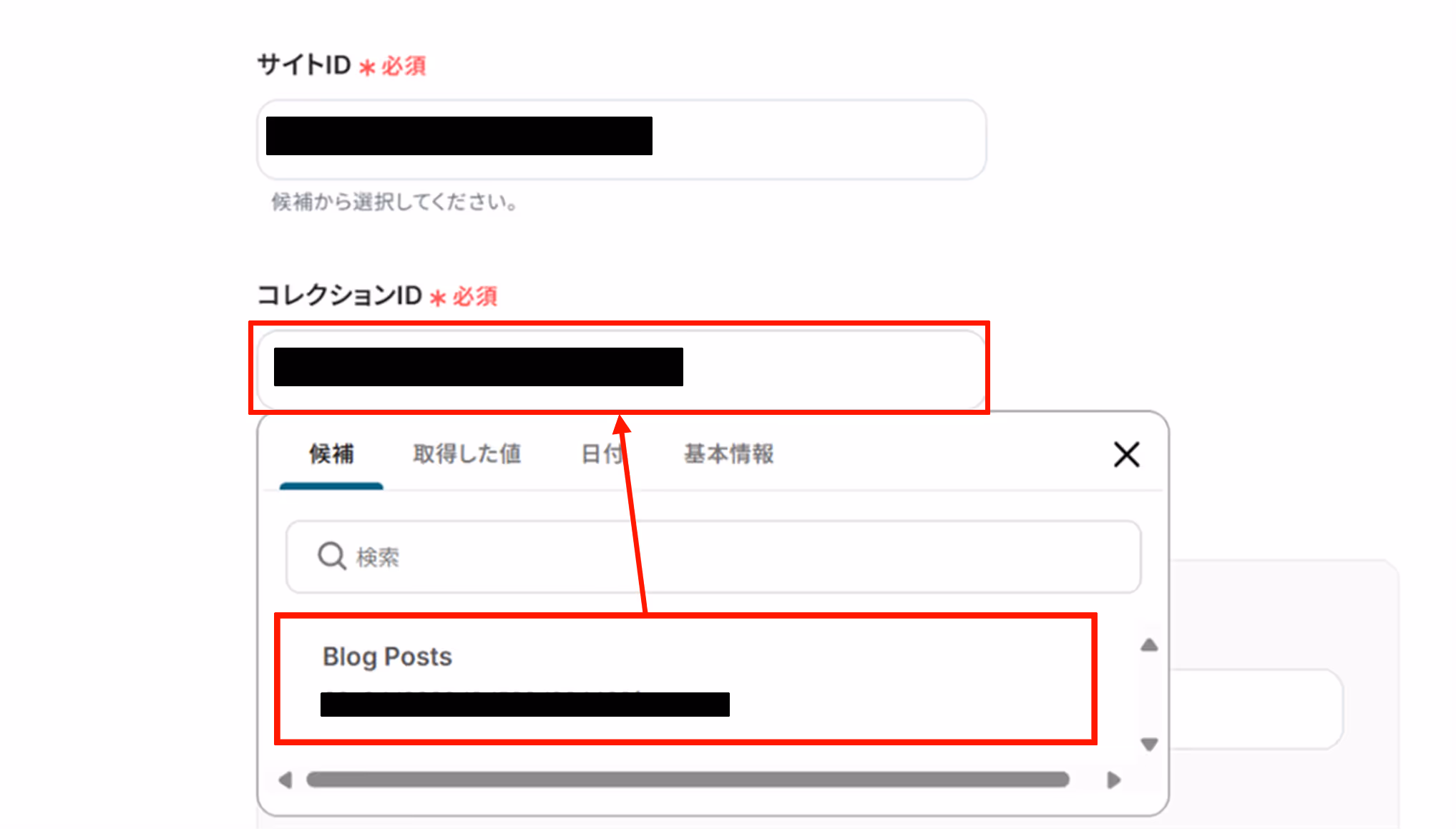 (3)「API接続設定」画面から、サイトID、コレクションIDを候補から選択します。