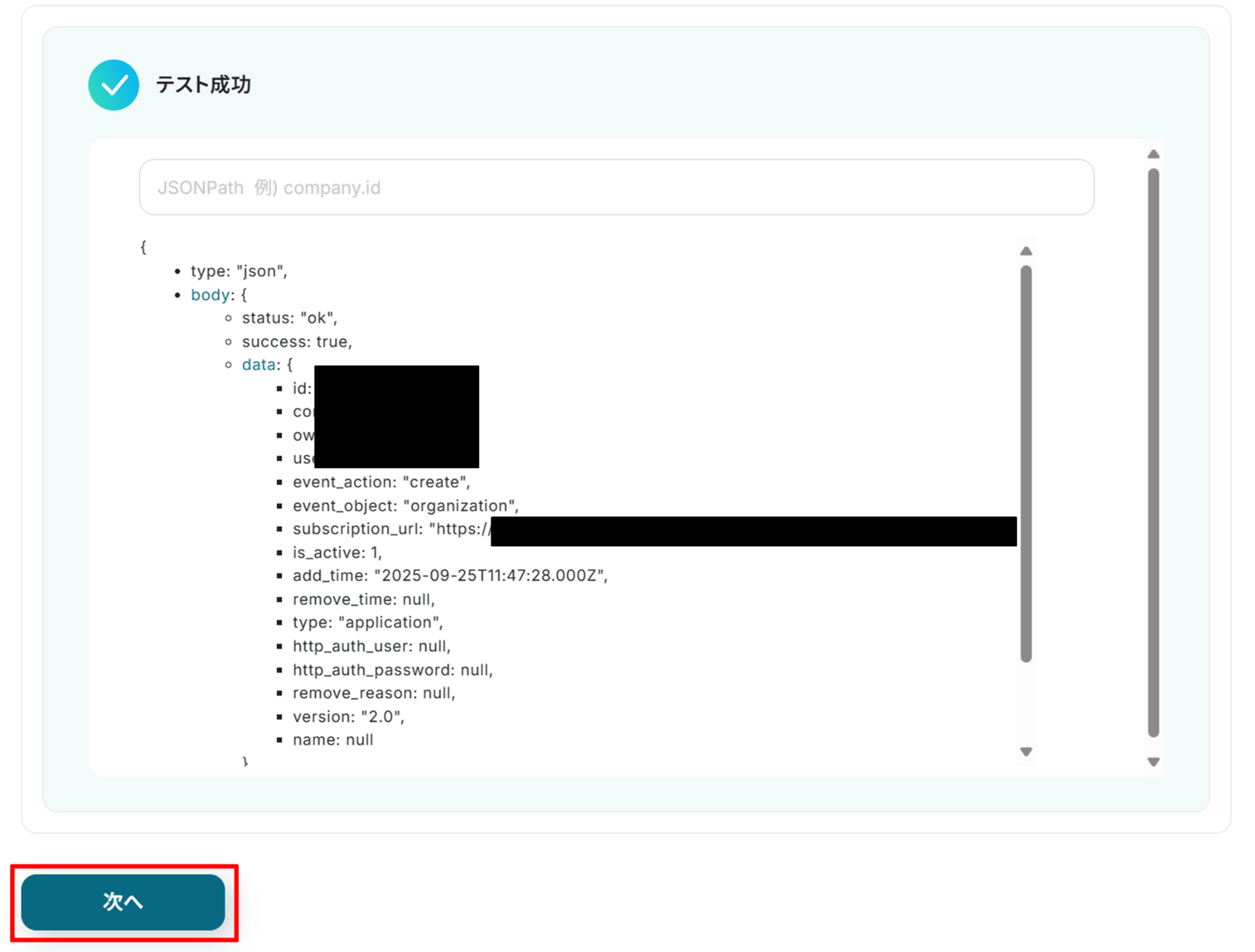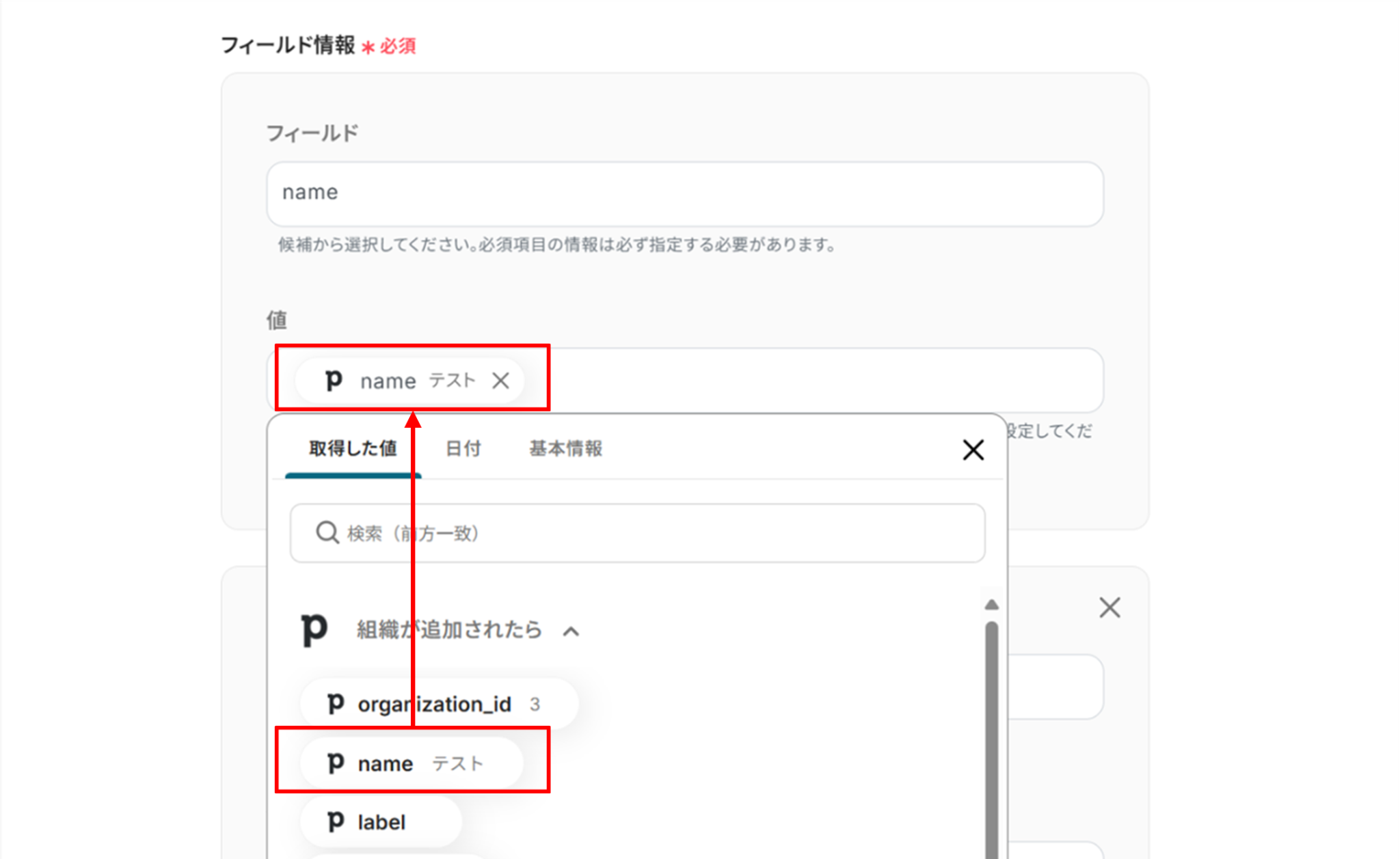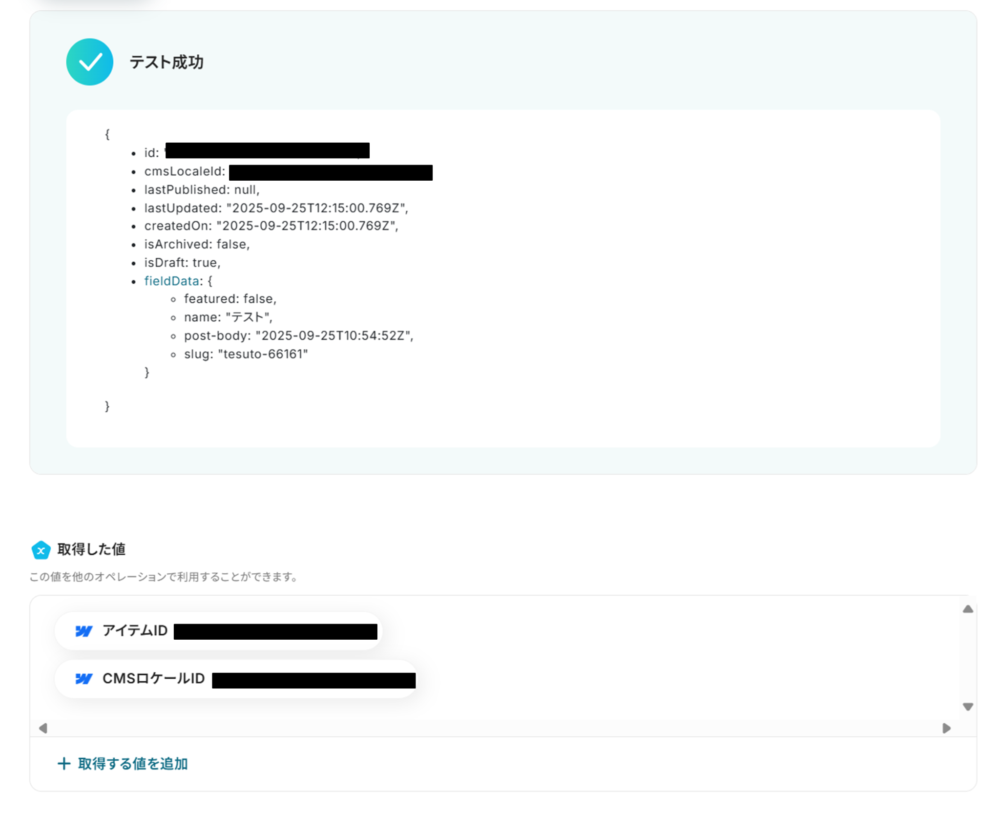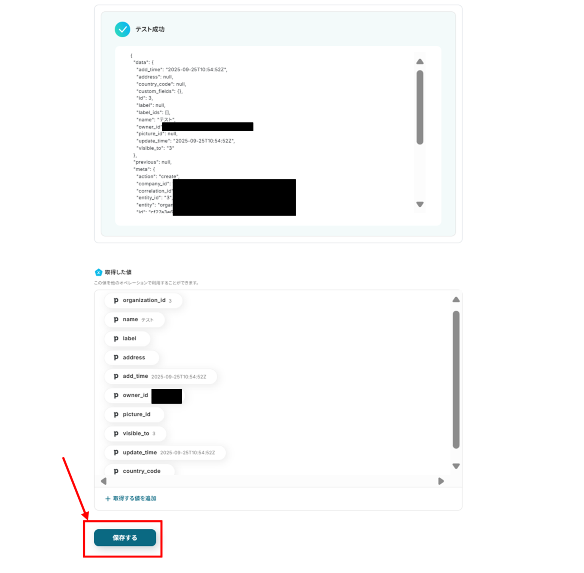 「取得した値」にPipedriveの情報が反映されればテスト成功です。
