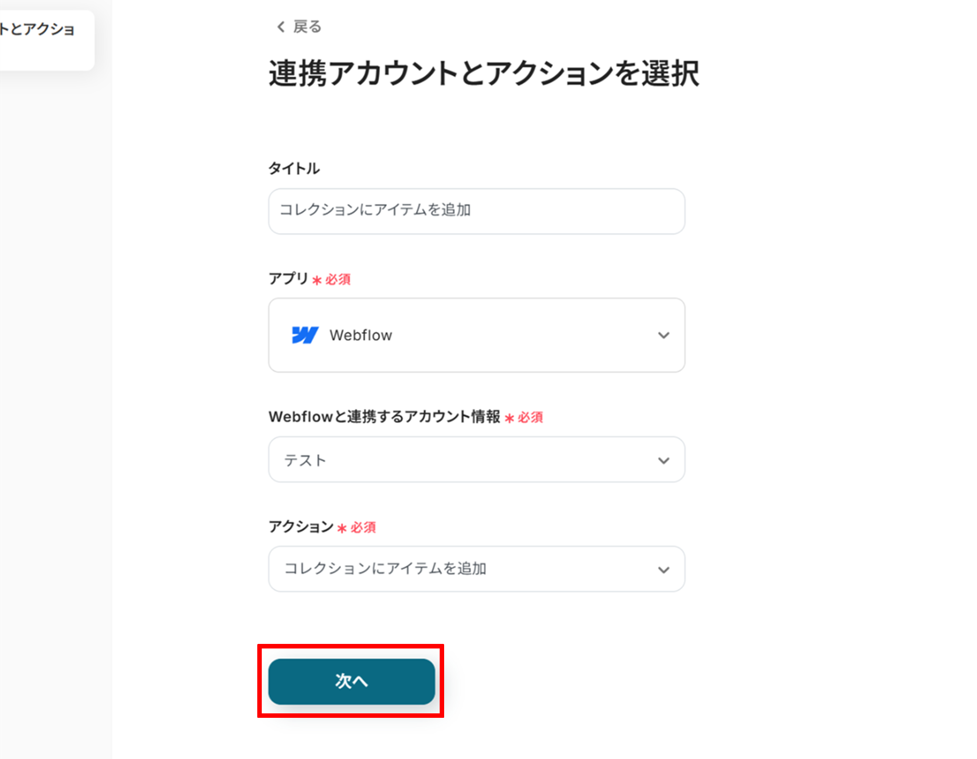 (2)「連携アカウントとアクションを選択」画面から、Webflowと連携するアカウント情報に誤りがないかを確認し、アクションは「コレクションにアイテムを追加」のままで「次へ」をクリックします。