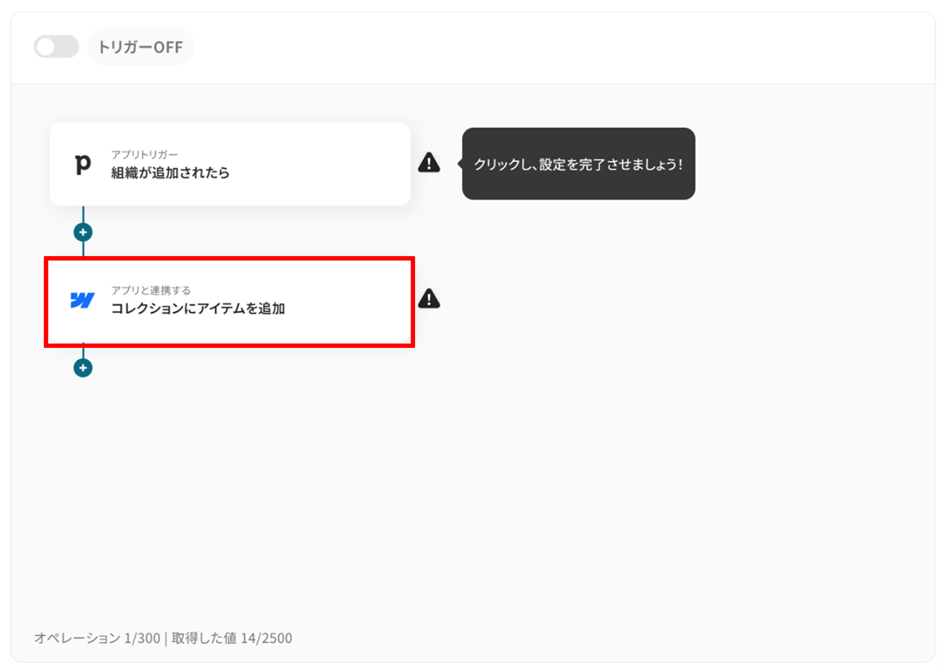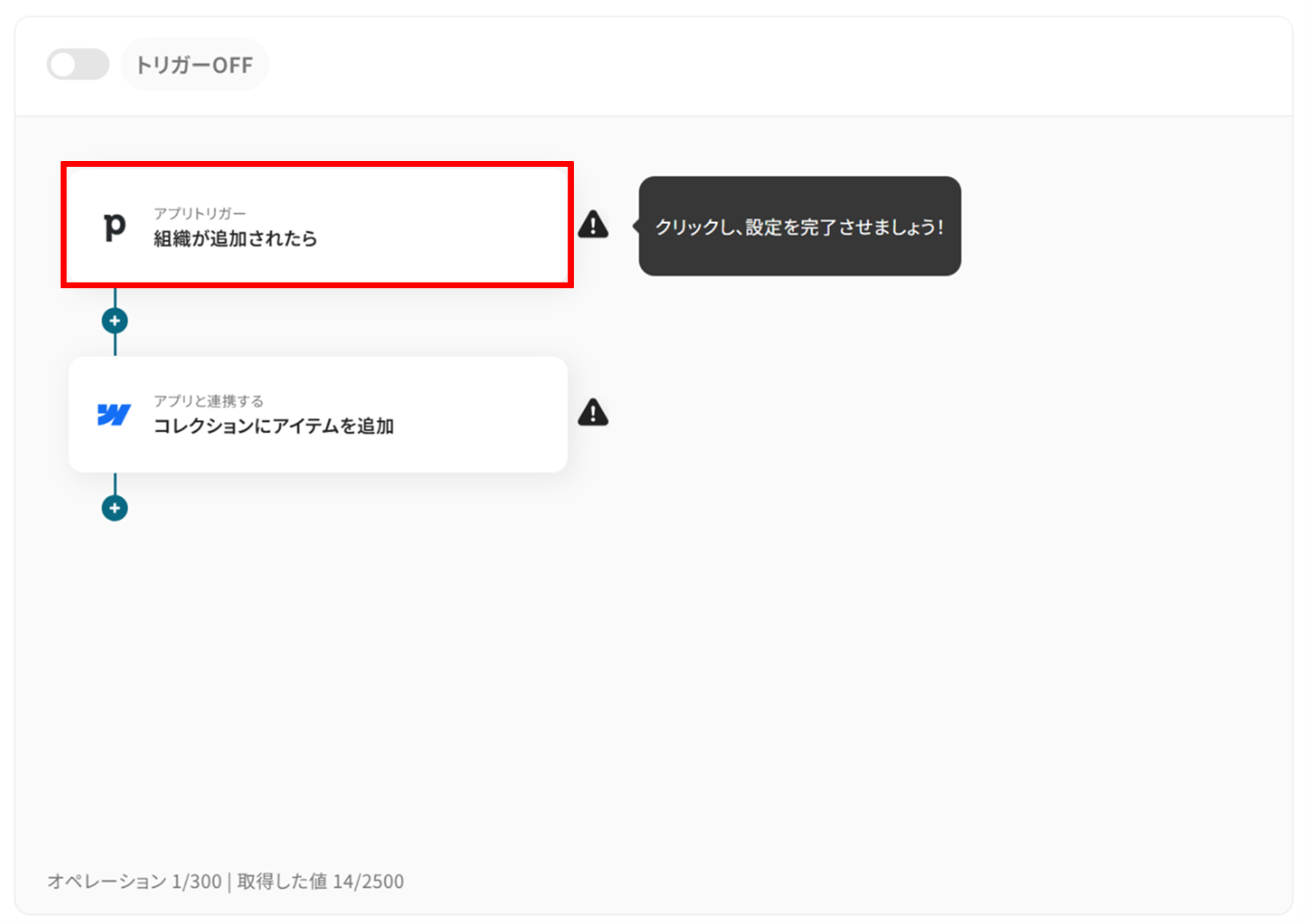 アプリトリガーの「組織が追加されたら」をクリックします。