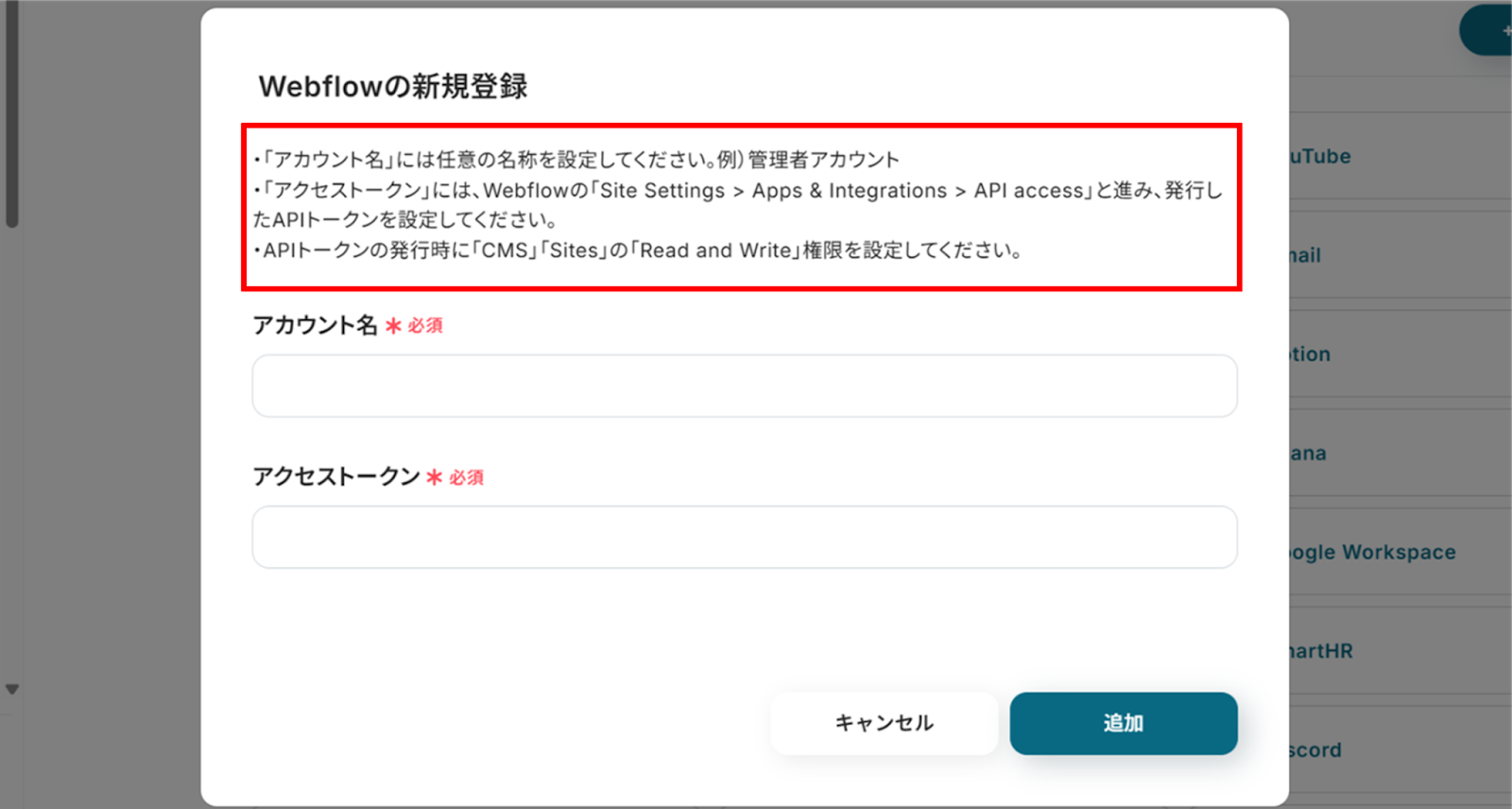 「Webflowの新規登録」画面から赤枠を確認の上、アカウント名、アクセストークンを入力し「追加」をクリックします。