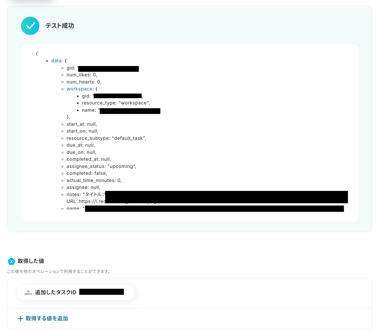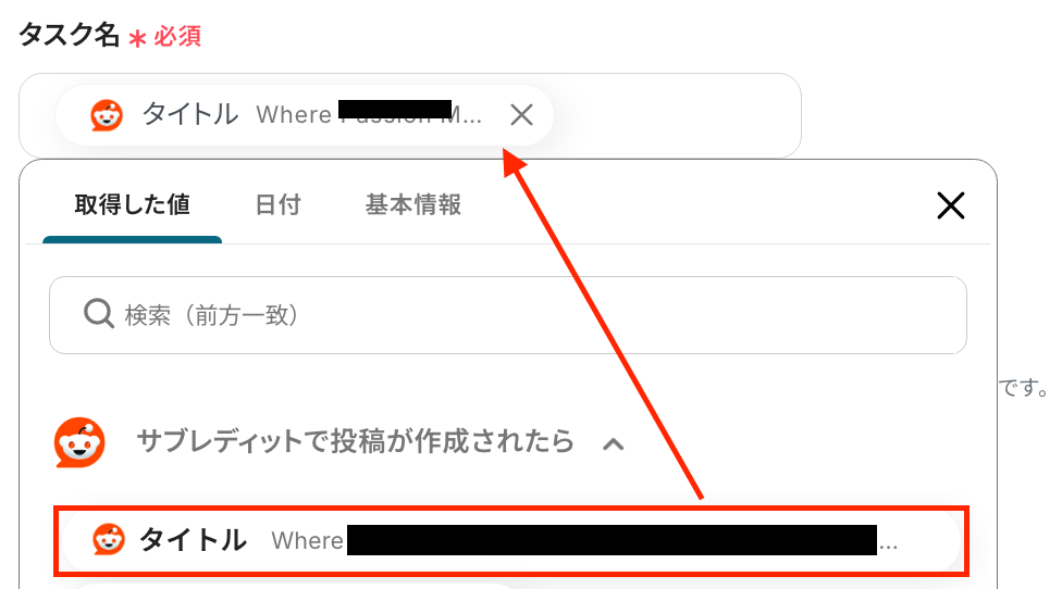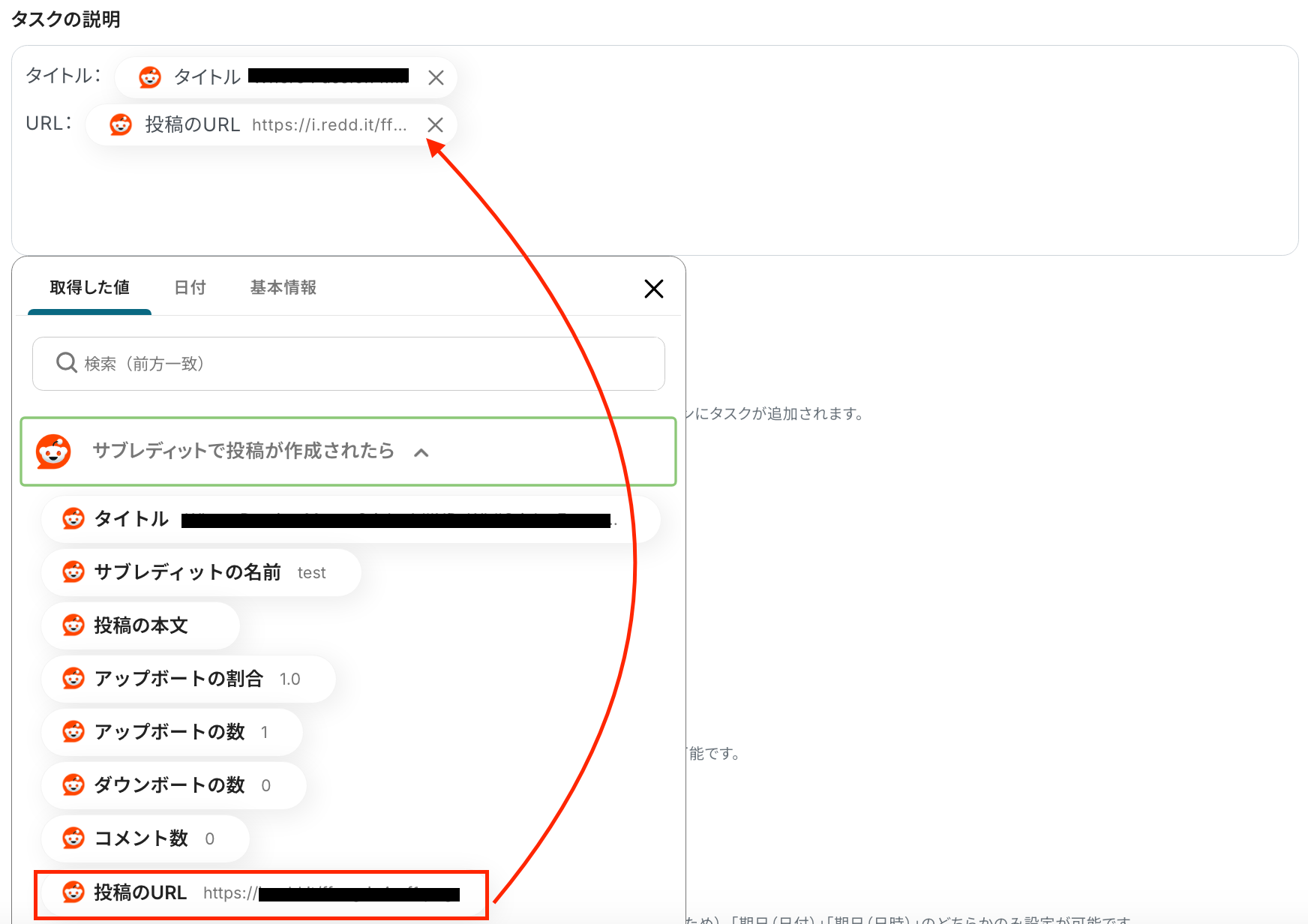 「タスク名」:入力欄をクリックして表示される取得した値を引用して設定してください。