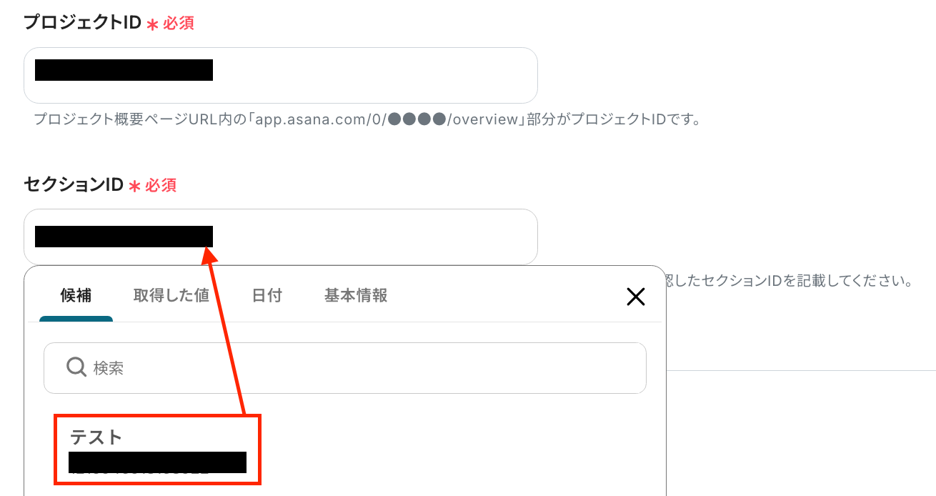 「プロジェクトID」「セクションID」:入力欄をクリックして表示される候補から選択してください。