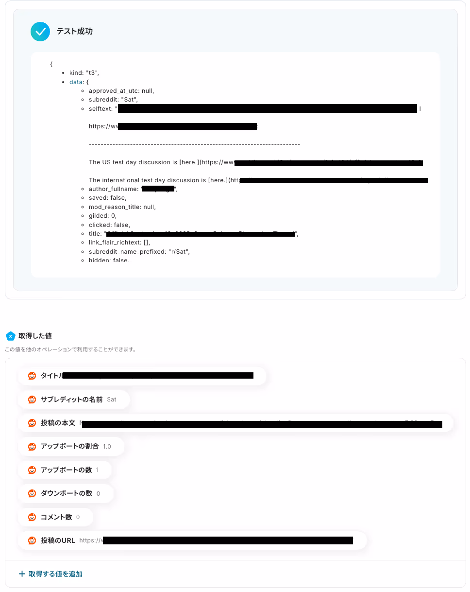 投稿を終えたら、Yoomの画面に戻り「テスト」を実行しましょう。テストが成功すると、取得した値が表示されます。