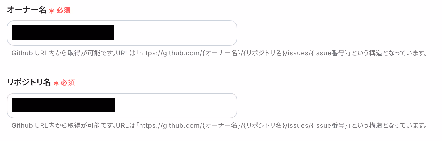「オーナー名」と「リポジトリ名」は、入力欄下の説明に従って直接入力してください。