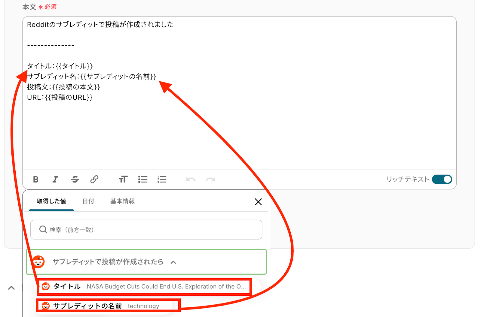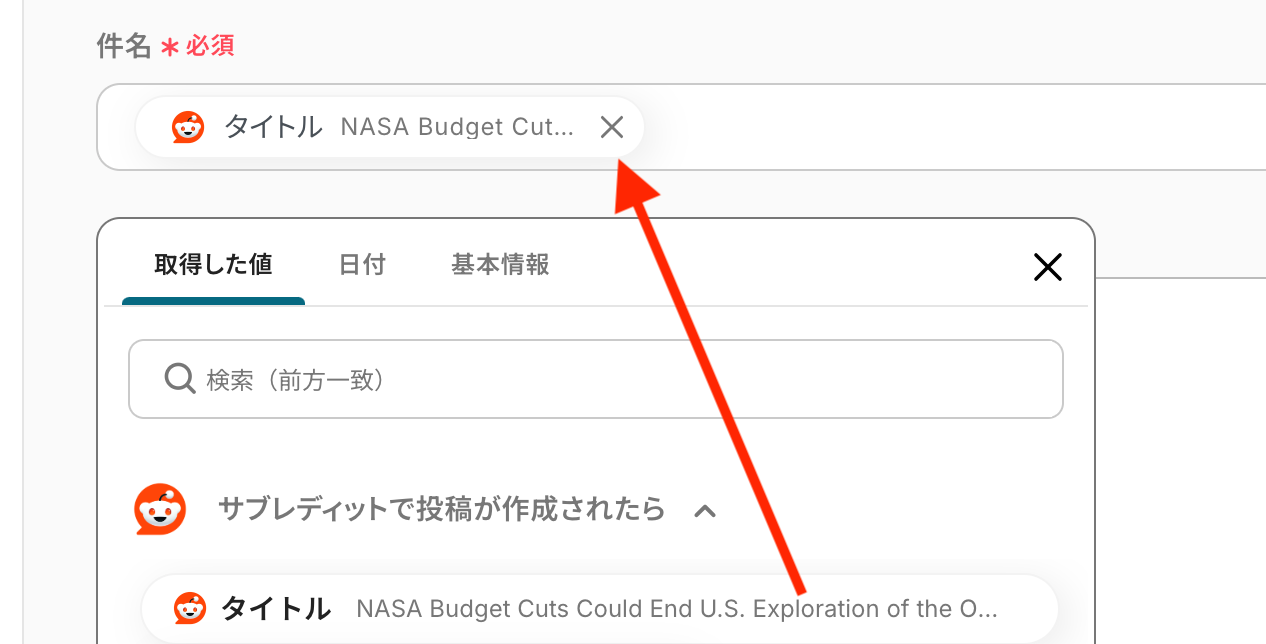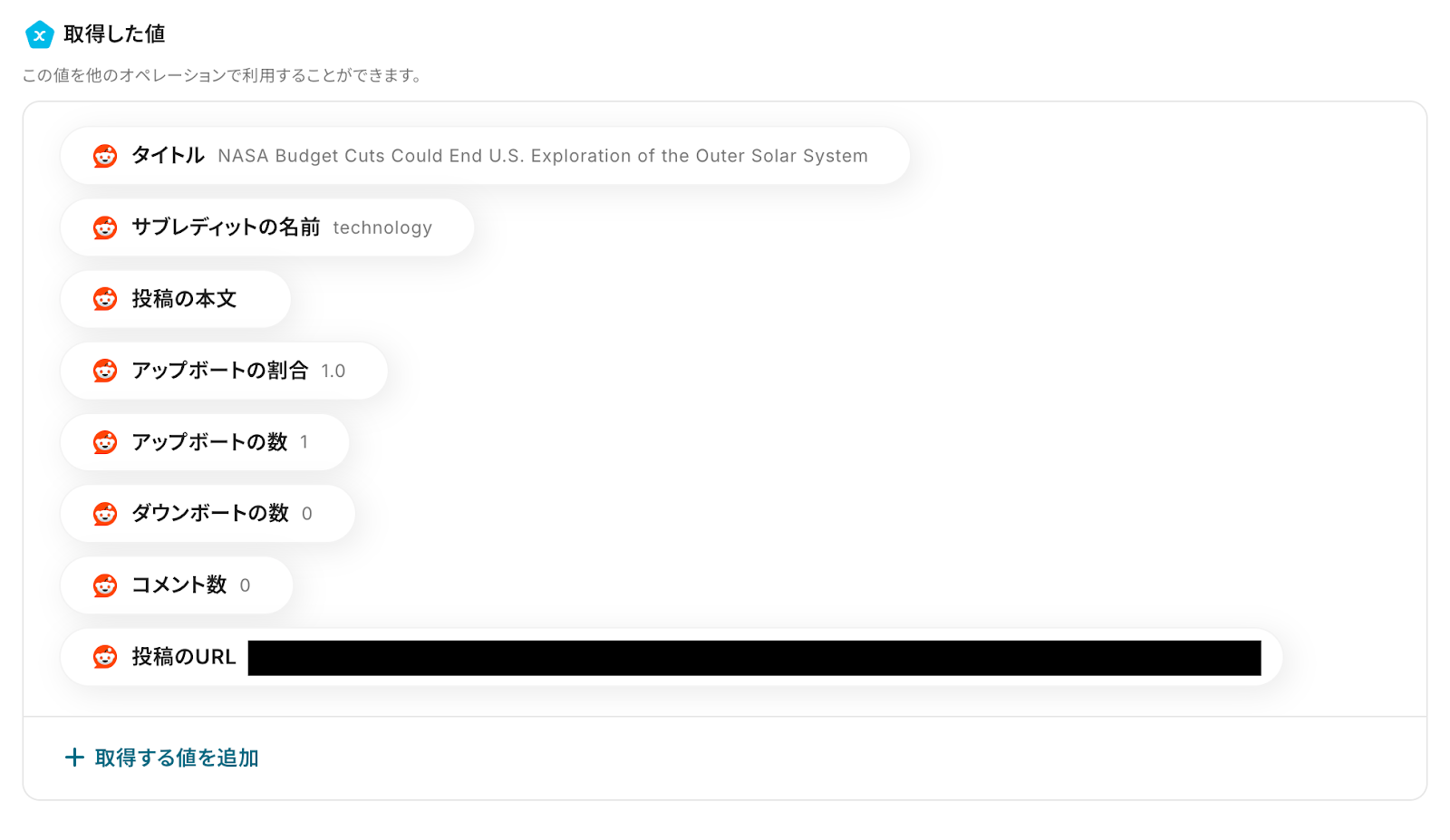 テストが正常に完了すると、「テスト成功」という画面が表示され、「取得した値(アウトプット)」としてRedditから取得した情報を引用できるようになります。