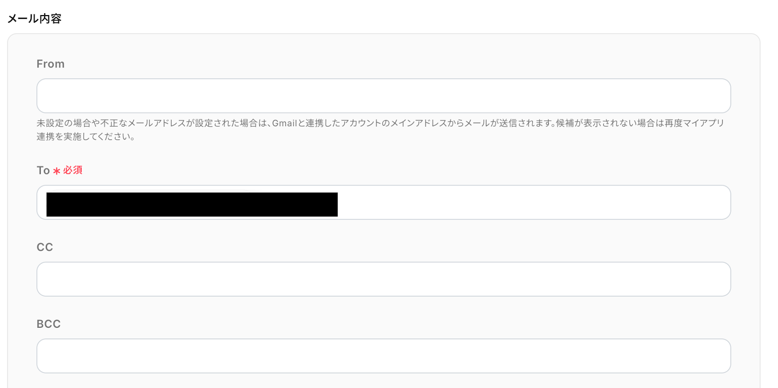 「From」には、メールを送信するGmailアカウントのアドレスを設定します。