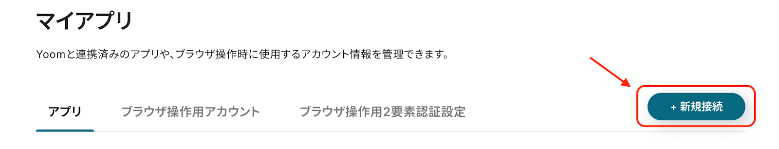 Yoom画面の左側メニュー「マイアプリ」をクリックし、「新規接続」を選びます。