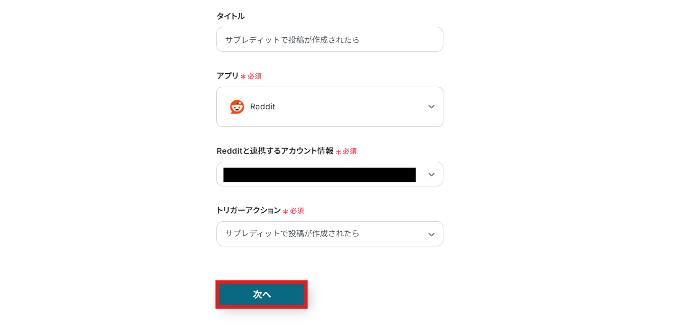 Redditと連携するアカウント情報はプルダウンから選択します。