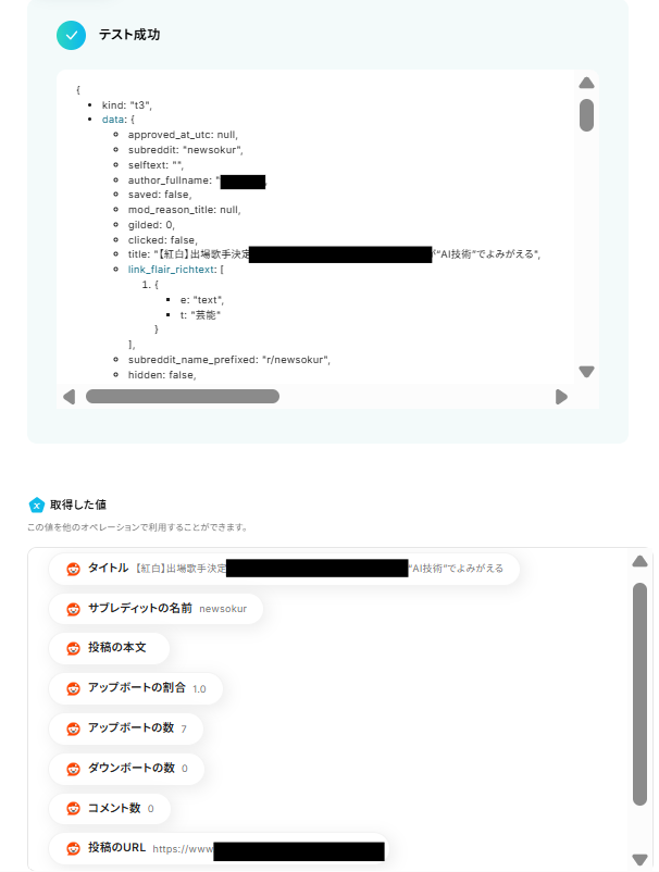 入力が終わったらテストボタンをクリックしてください。テストが成功し、取得した値が入ればOKです。