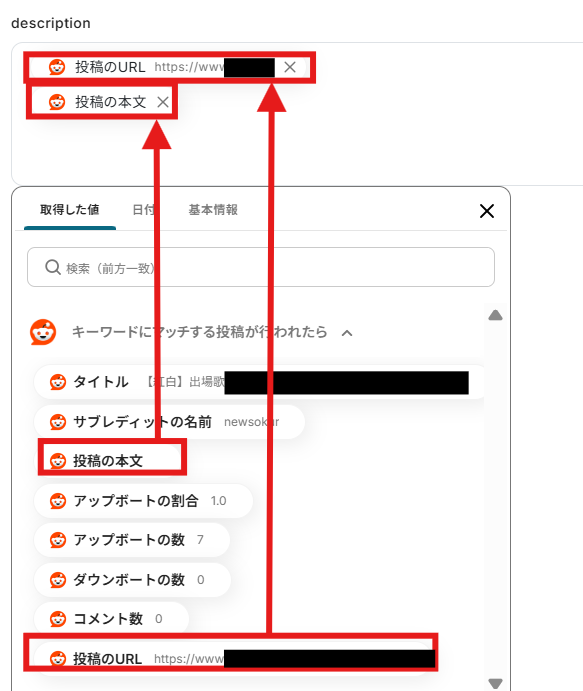 descriptionには、投稿のURLと投稿の本文を取得した値から入力しました。