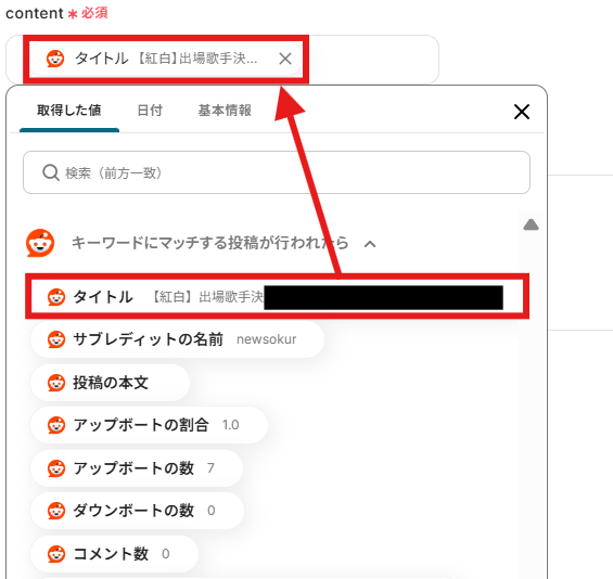 コンテンツタイトルは取得した値から「タイトル」を入力していきます。取得した値を活用することで、固定値ではなく、トリガーが実行されるたびに最新の情報が反映できます。