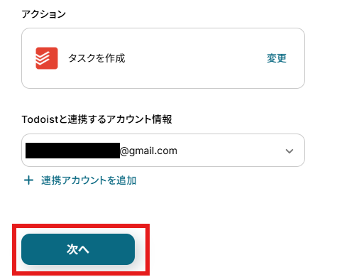 アクションはデフォルト設定のまま、アカウント情報は、連携したいアカウントが選択されているか確認してください。確認出来たら「次へ」をクリックしましょう。
