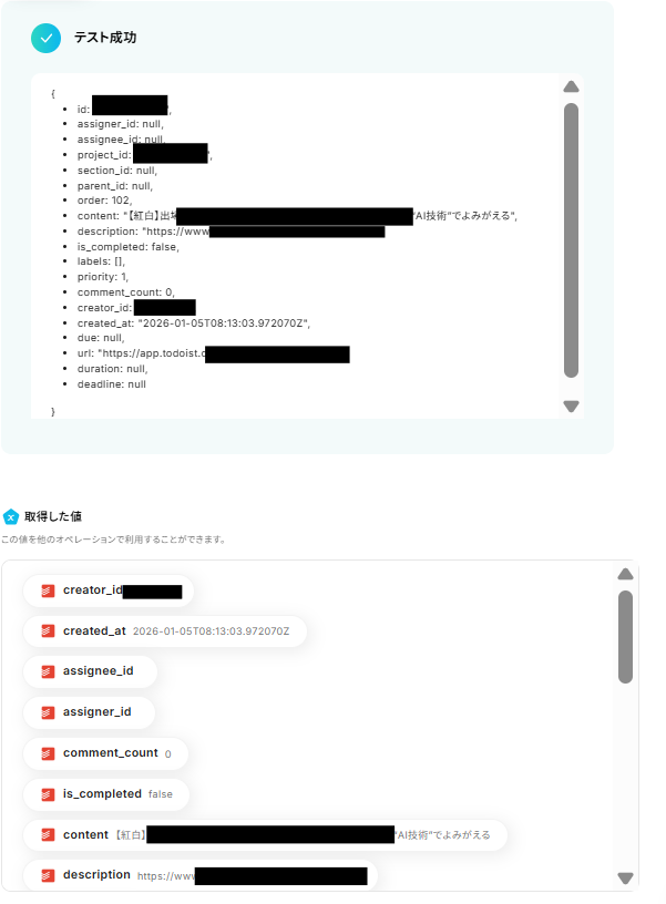 - 最後に、オペレーションでTodoistの「タスクを更新」を設定し、取得した情報をもとに対応するタスクを更新します。