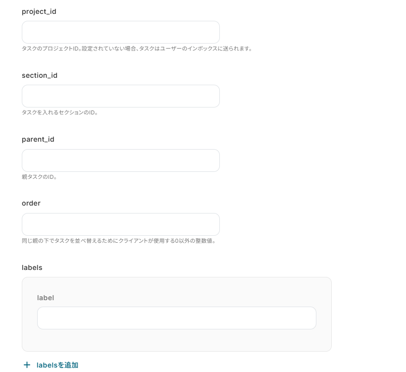 - Todoistでタスクを更新するアクションでは、更新するタスクの内容(content)や詳細(description)、プロジェクトIDなどを任意で設定してください。