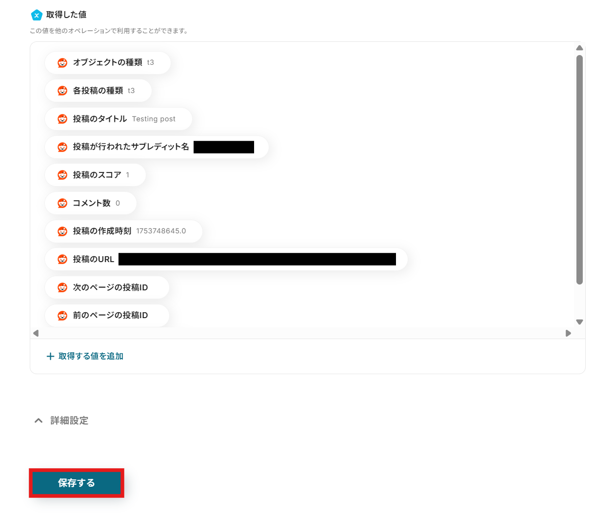 このフローは、Redditのデータを直接X(Twitter)に連携するシンプルな仕組みです。