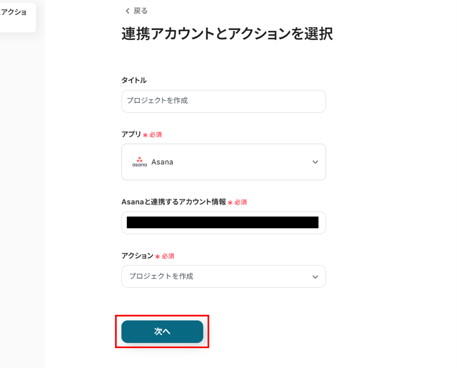(2)「連携アカウントとアクションを選択」画面から、Asanaと連携するアカウント情報に誤りがないかを確認し、アクションは「プロジェクトを作成」のままで「次へ」をクリックします。