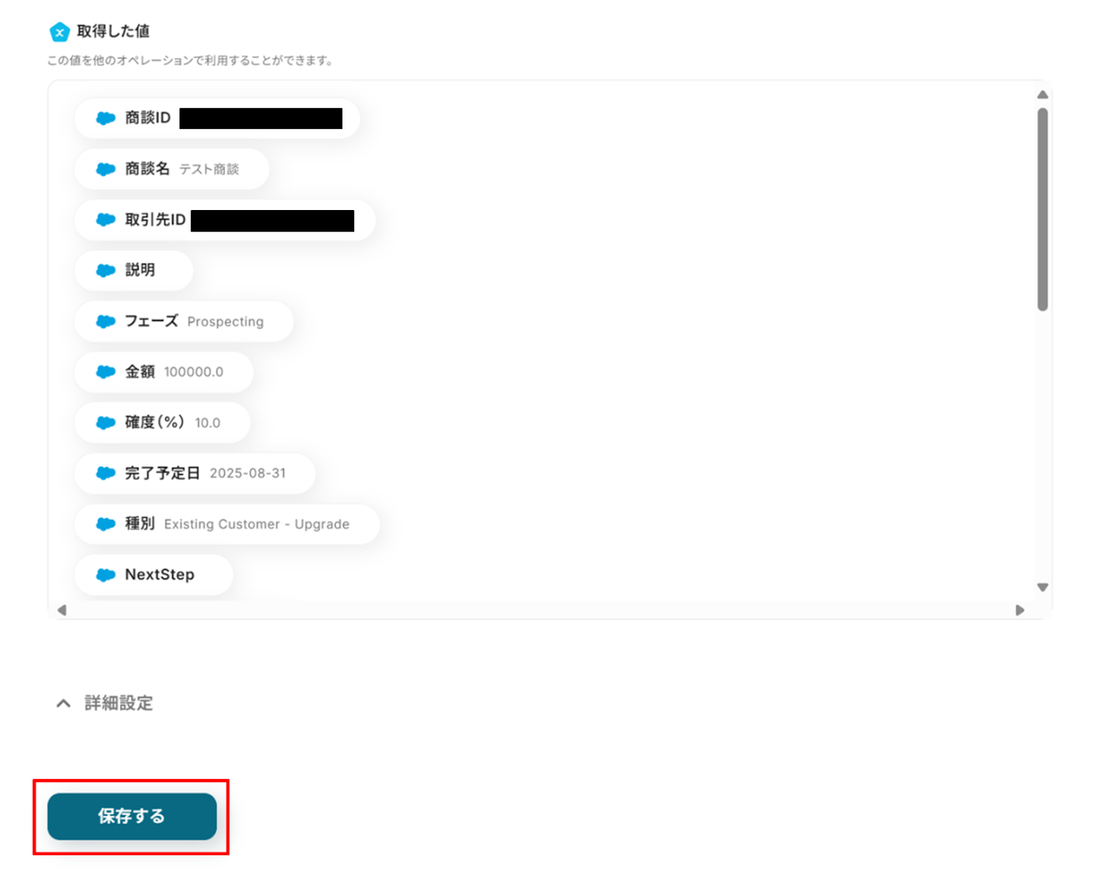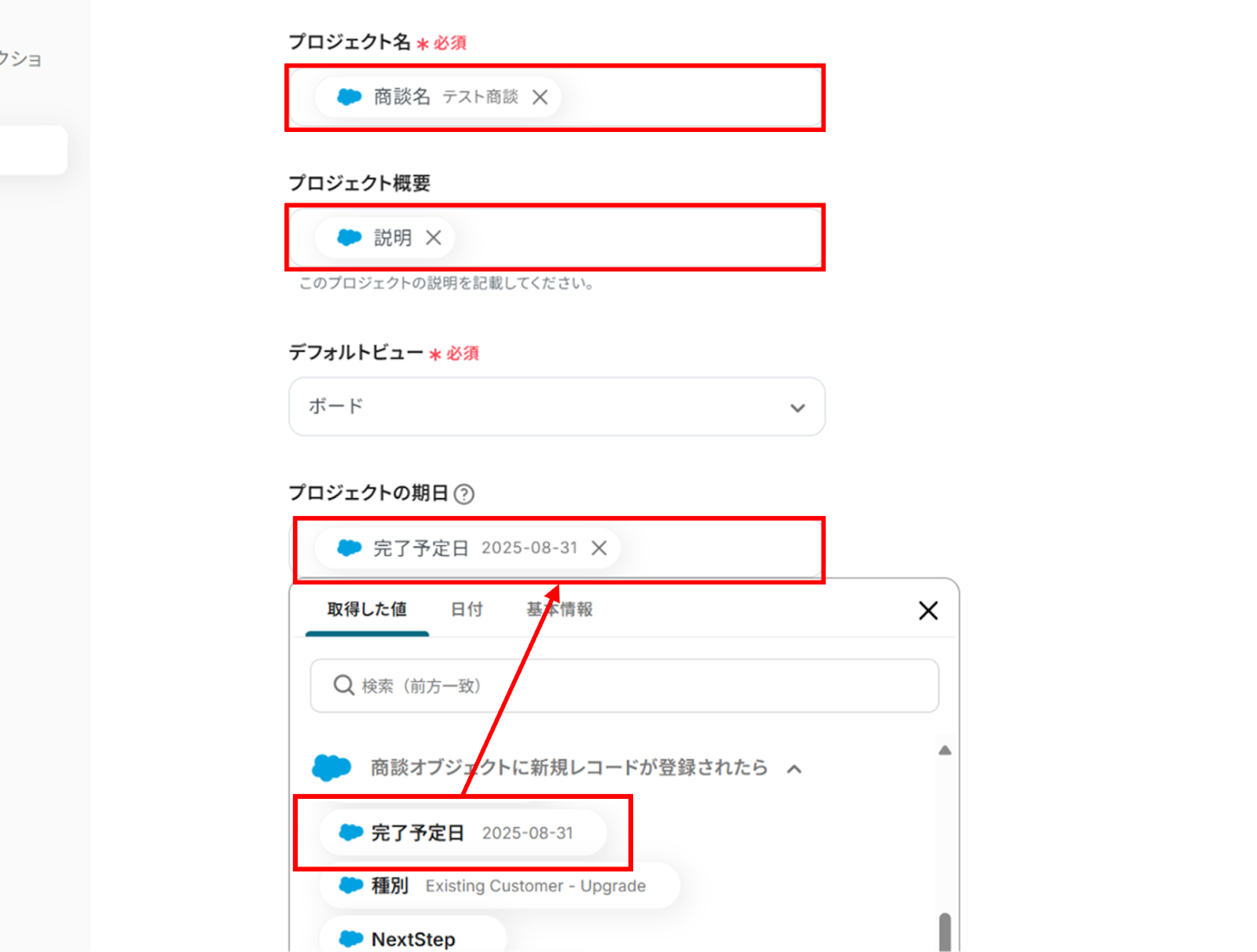Salesforceに登録されたレコードに入力されている商談金額や取引先名、フェーズなどを「取得した値」より選択することで、連携することができます。