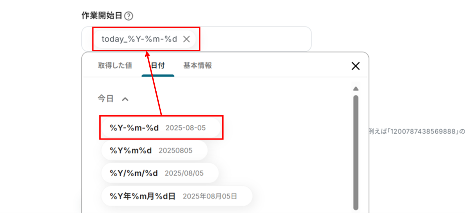 下の画像のように作業開始日には日付を選択することで、フローボットが起動した際に自動で当日の日付が入力されます!