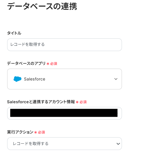 先ほどと同様にタイトルを任意で設定し、連携するアカウント情報がマイアプリ連携をしたアカウントと一致することを確認したら、アクションはテンプレート通りに「レコードを取得する」のまま下にスクロールしましょう。
