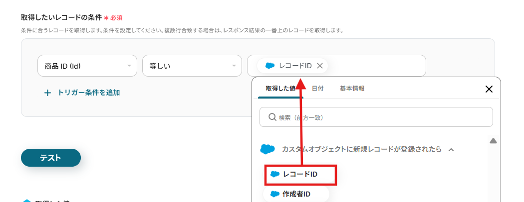 4.「取得したいレコードの条件」をアウトプットから以下のように設定し、「テスト」を実行しましょう。