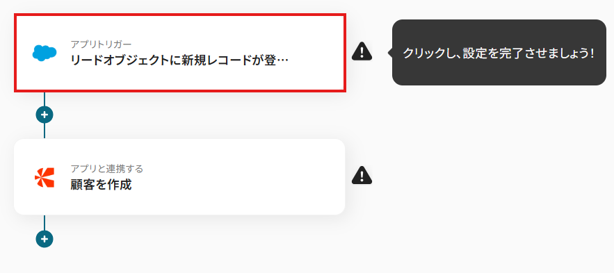 先ほどの画面で「OK」をクリックして、表示された画面のアプリトリガー「リードオブジェクトに新規レコードが登録されたら」をクリックしましょう。