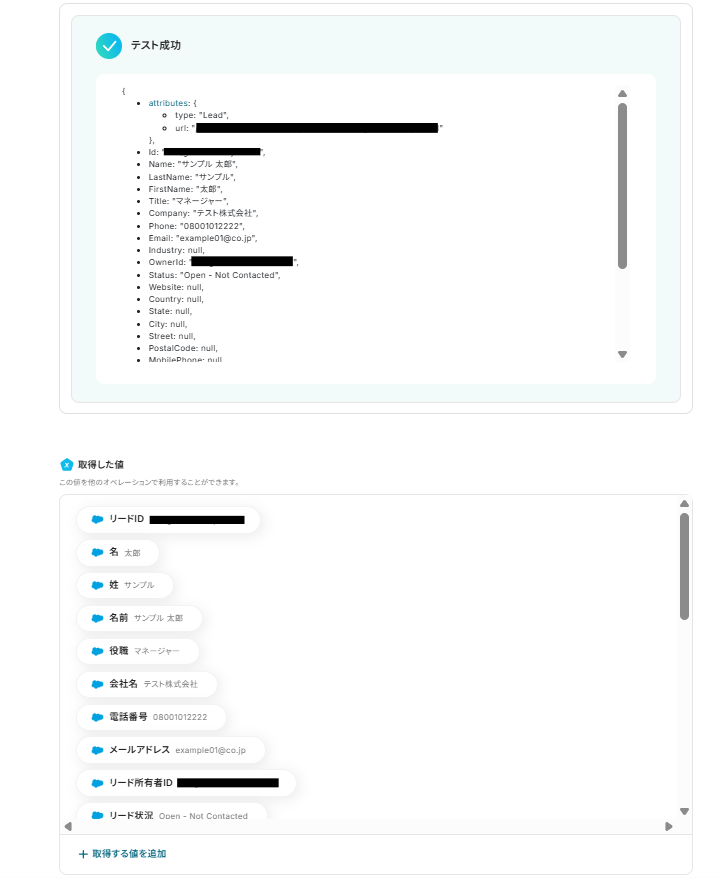 5.入力を終えたら「テスト」をクリックし、「取得した値」にデータが抽出されていることを確認してください。