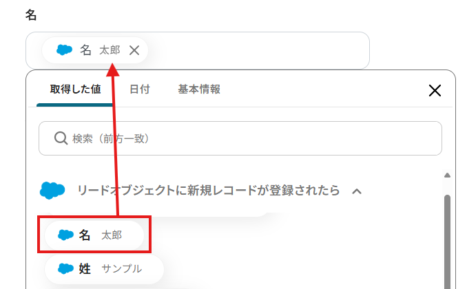 「名」「姓」「メールアドレス」「電話番号」は、入力欄をクリックして表示される取得した値から選択してください。