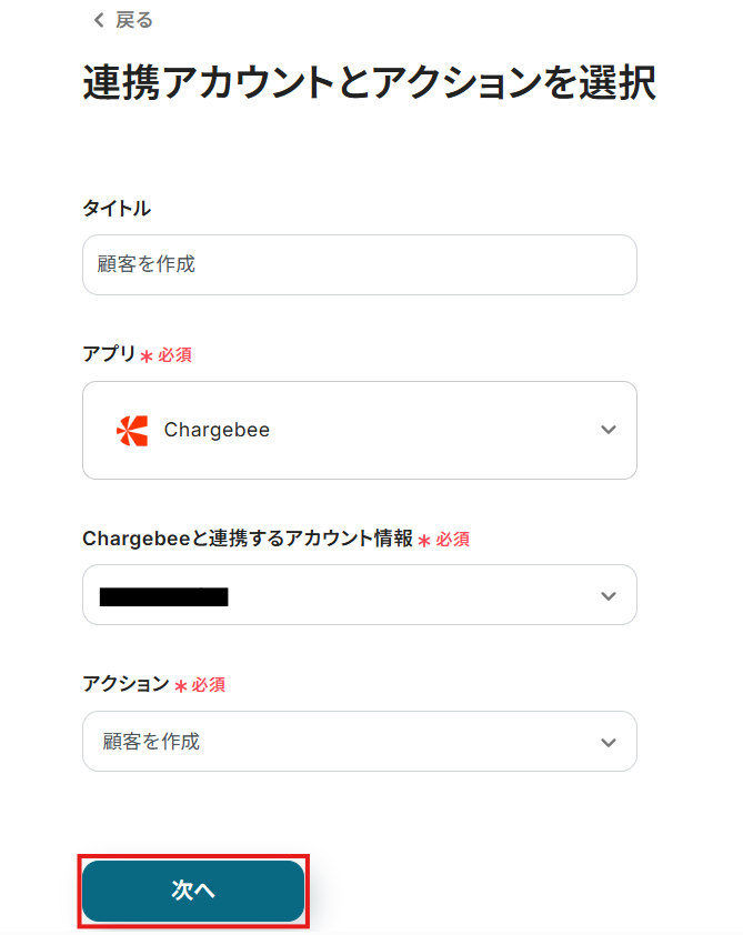 連携するアカウント情報には、ステップ1で連携したアカウント情報が反映されています。トリガーアクションはそのままにして、「次へ」をクリックしてください。