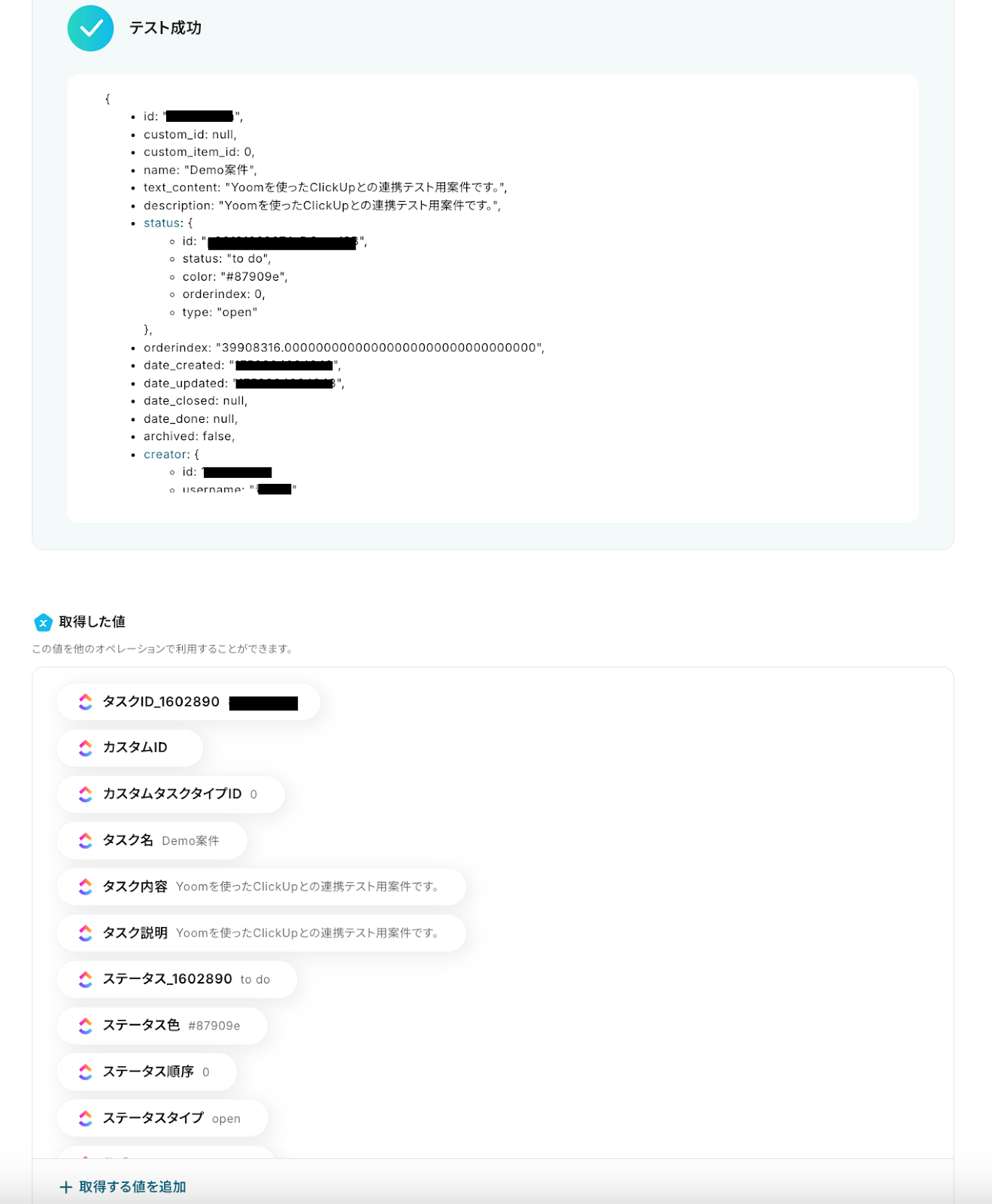 テストを成功させることで「取得した値」が取得でき、前述したように後続のオペレーション設定時に活用できます。
