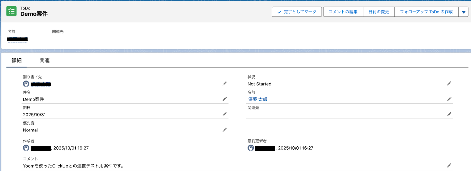 設定完了後は動作チェックのためにテストを行いますので、Salesforceの画面に移動し、ToDoオブジェクトにテスト用のレコードを登録してください。
