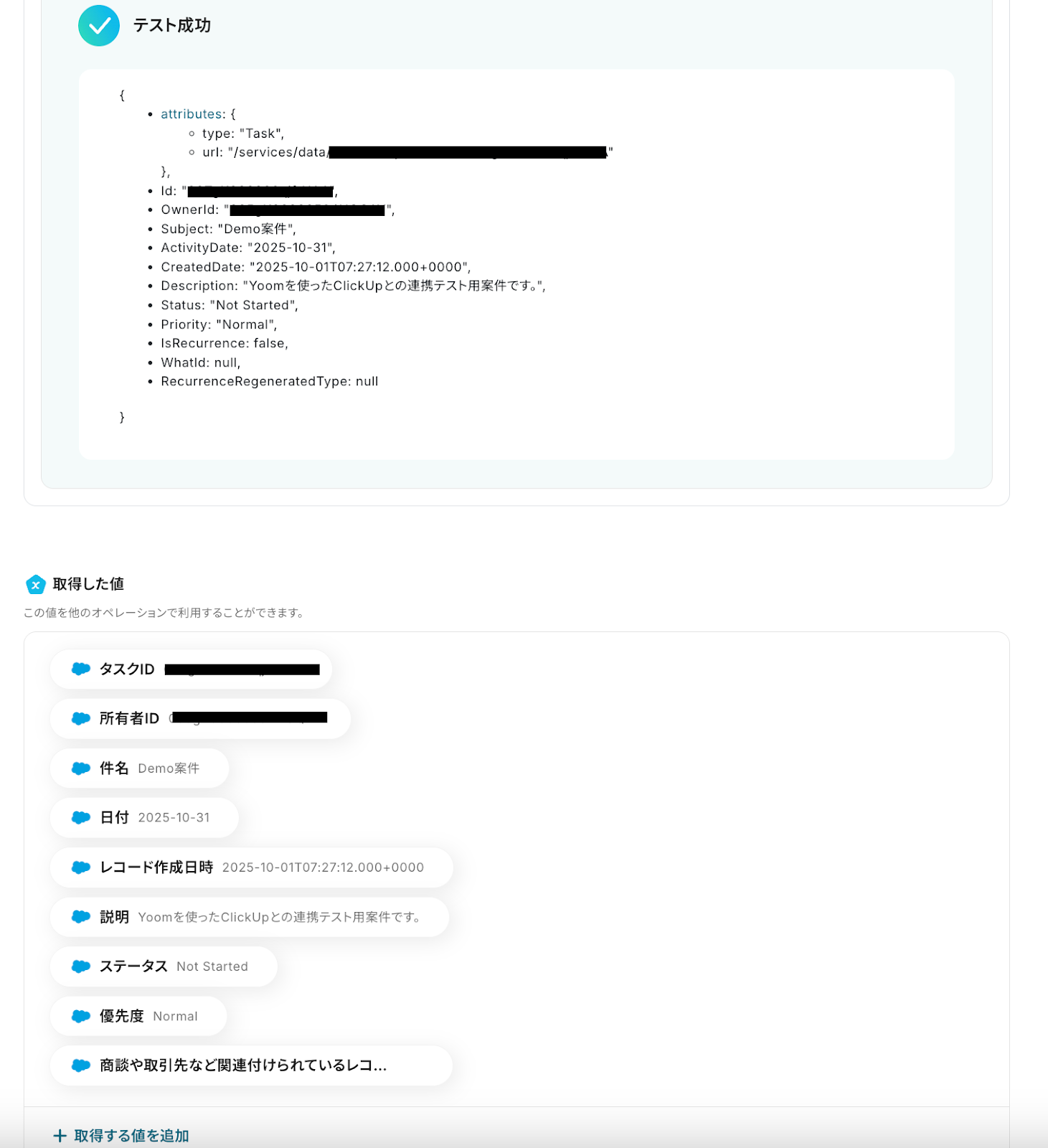 テストが成功すると、先ほど登録したレコードの情報が「取得した値」に抽出されるので、内容を確認しましょう。