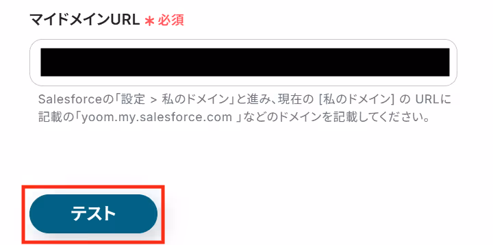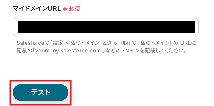 Yoomの操作画面に戻り、マイドメインURL欄にコピーしたURLを貼り付け「テスト」をクリックします。