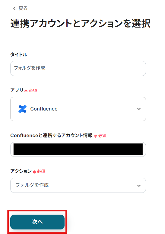 Salesforceと同様に、ステップ1でマイアプリ連携したConfluenceのアカウント情報が自動で表示されます。