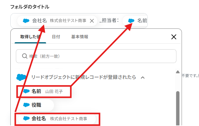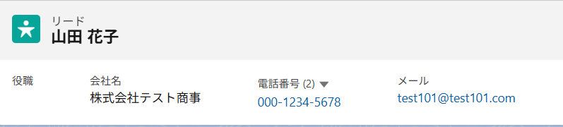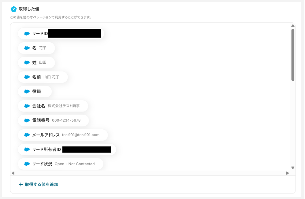 テストに成功すると、取得した値の各項目の横にSalesforceに登録したリードの詳細情報が表示されます。