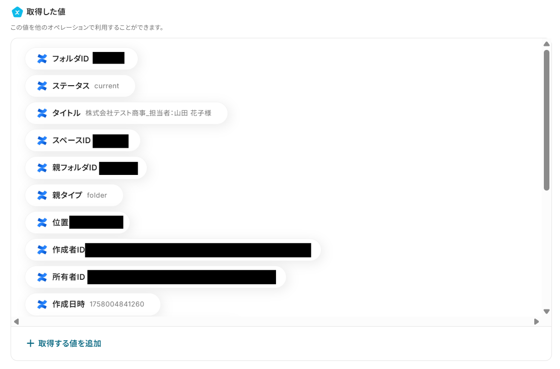 トリガーやオペレーション設定時に、「テスト」を実行して取得した値のことを指します。後続のオペレーション設定時の値として利用でき、フローボットを起動する度に変動した値となります。