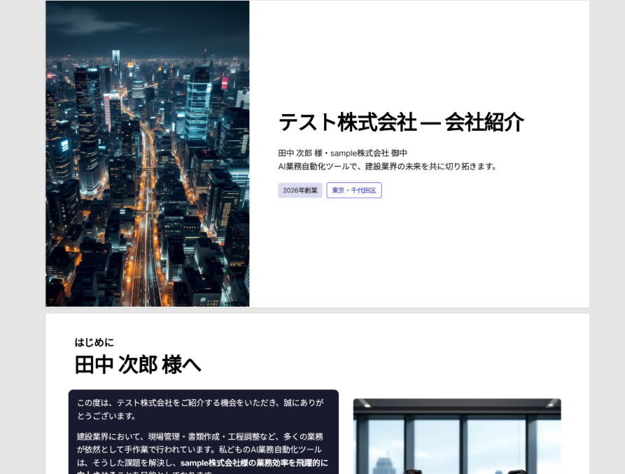 Salesforceに新規リードが登録されたタイミングで、自動的にGammaで個社別の会社紹介スライドを生成することで、これまで資料作成にかかっていた時間を削減し、ヒューマンエラーを防止できます。
