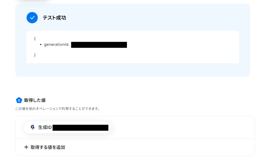 テストに成功しました! テストに成功すると、取得した値に「生成ID」が追加されます。 「完了」をクリックして次の工程に進みましょう。