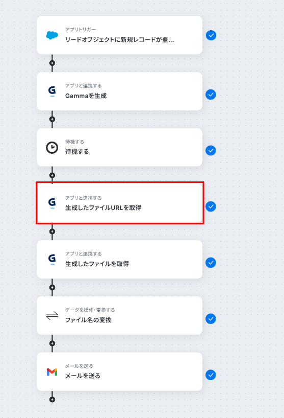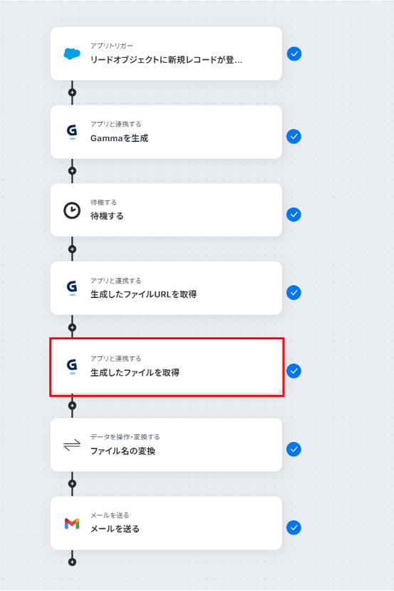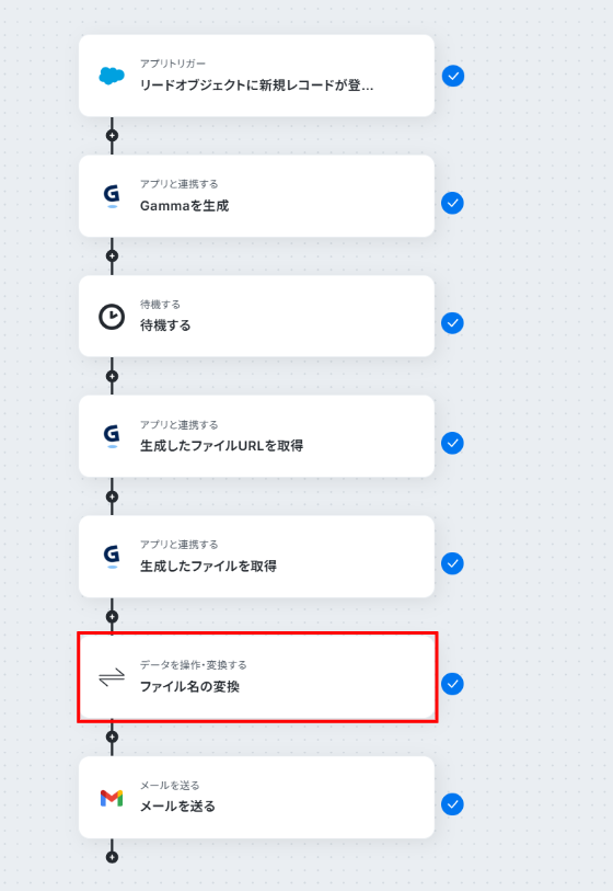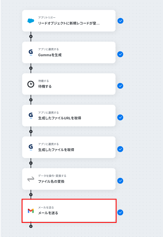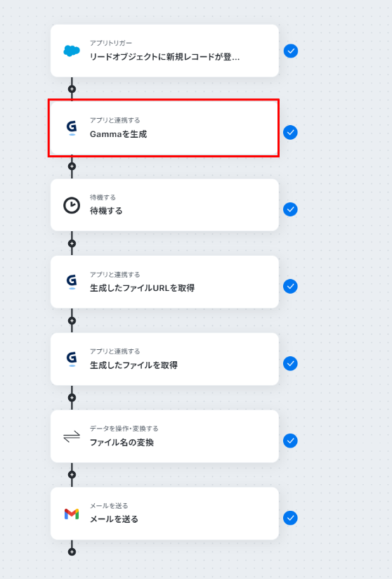 Gammaでスライドを生成する際に、Salesforceから連携するリード情報(会社名、氏名など)は任意で設定可能です。 Gammaで生成したスライドのファイル名は、「【株式会社〇〇様】会社紹介資料」のように、任意の内容に変換できます。 Gmailの「メールを送る」オペレーションでは、送信先のメールアドレス、件名、本文を自由に設定することが可能です。 ■注意事項